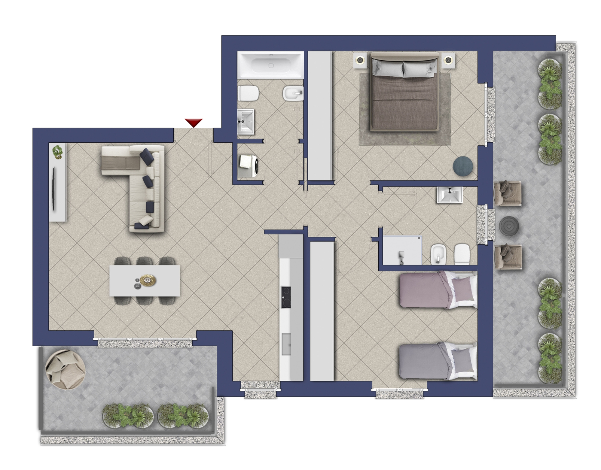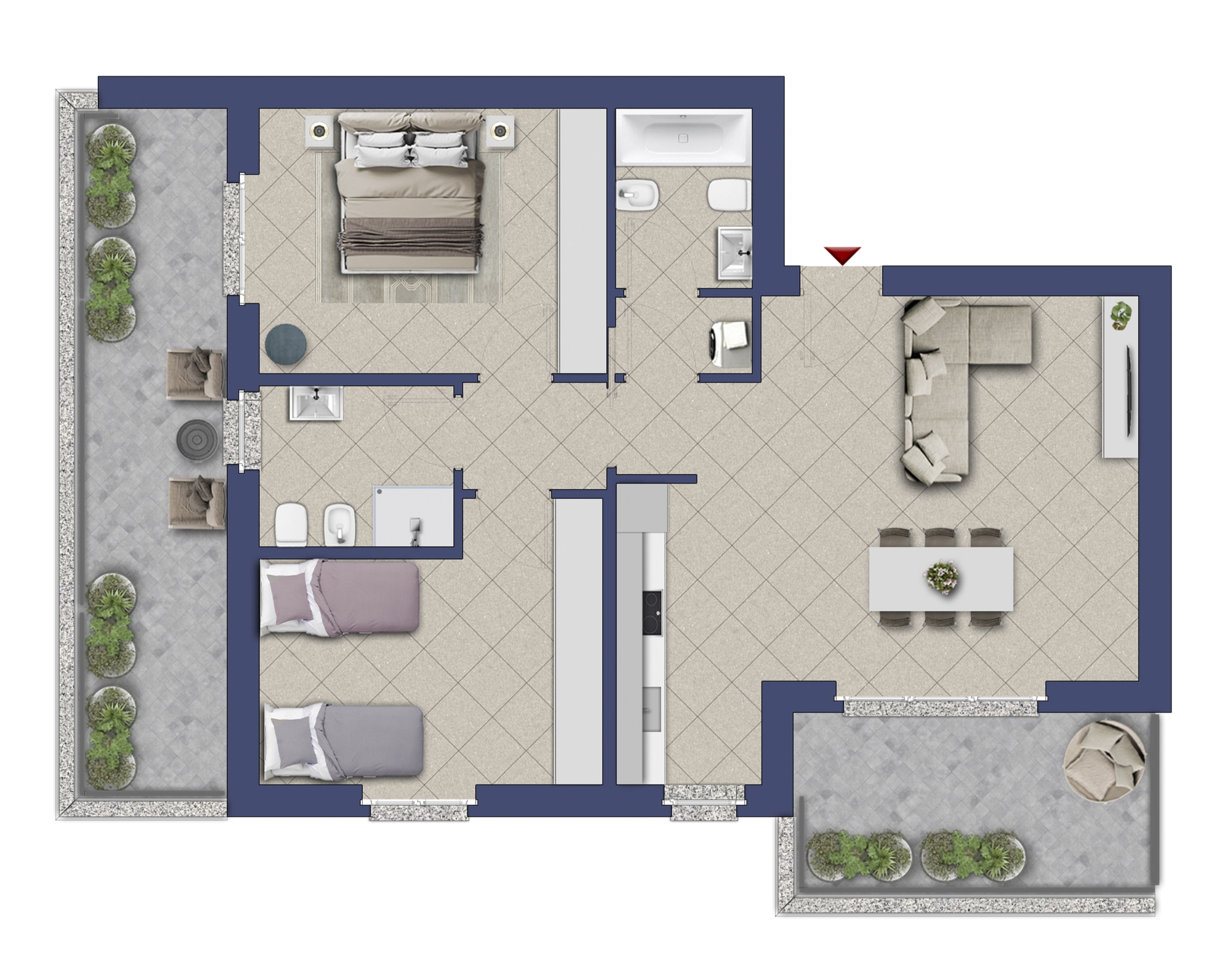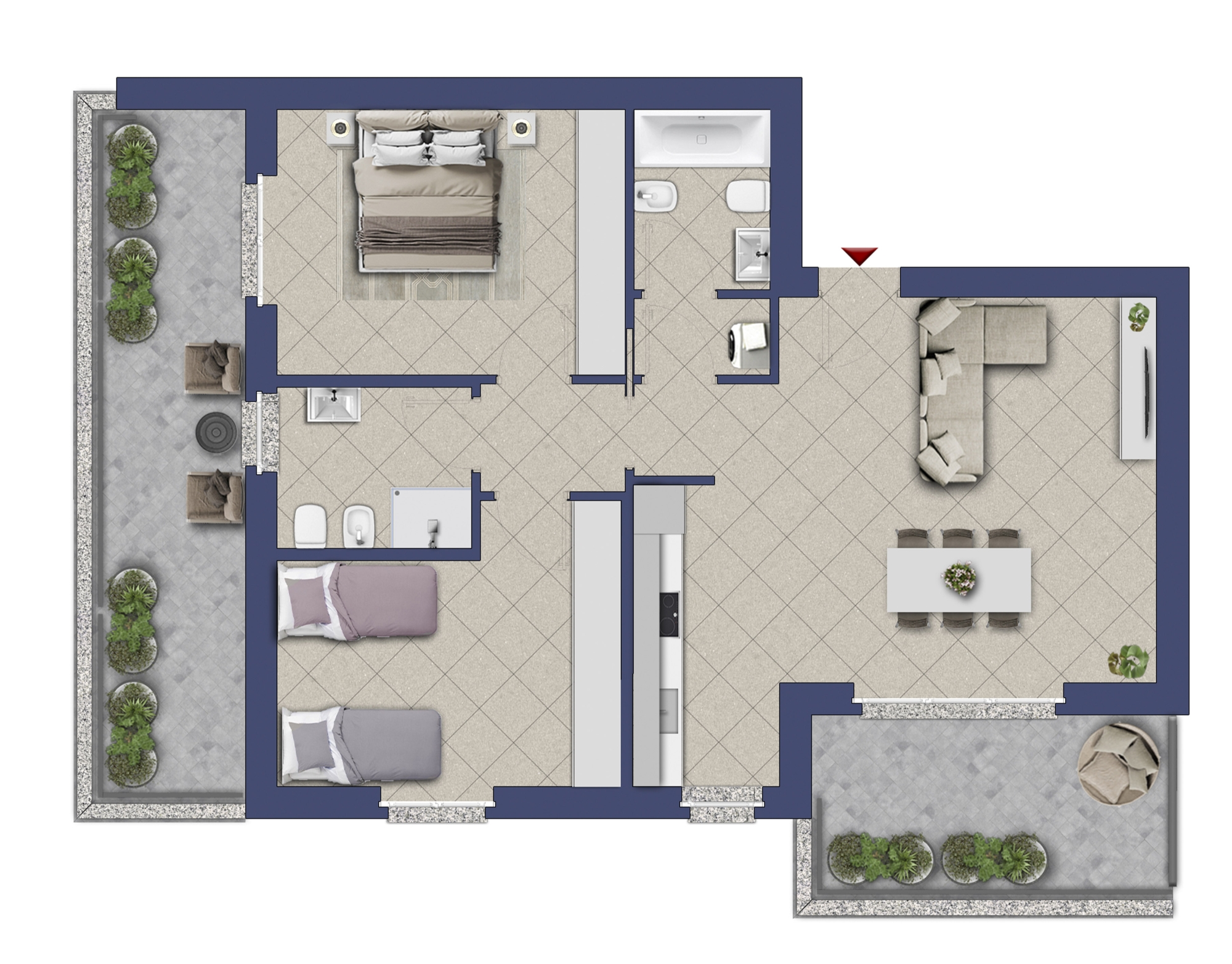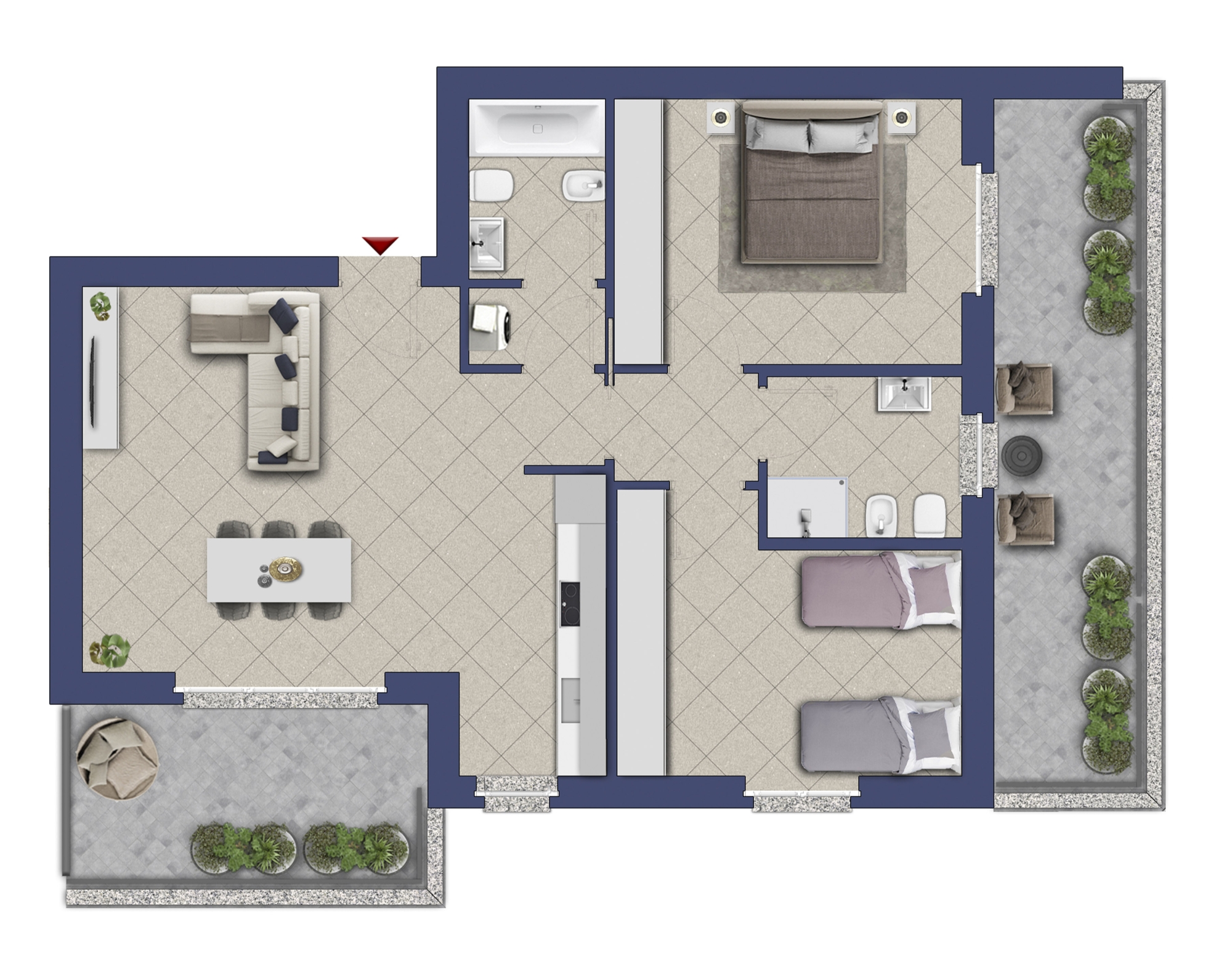 Gli spazi abitativi sono stati realizzati con la massima cura già dal momento della loro progettazione, dando particolare attenzione al singolo dettaglio come il terrazzo che è; una prerogativa per ogni appartamento, l'impianto elettrico smart permette di poter controllare temperature, luci e tapparelle anche da remoto e l'arredamento pensato per vivere le soluzioni al meglio.